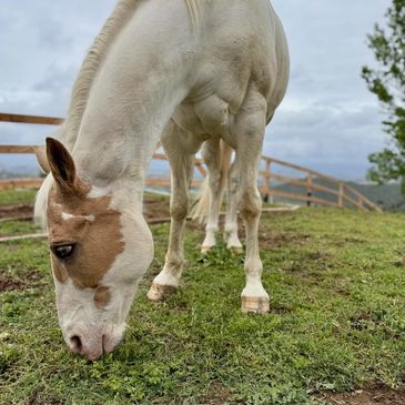 Sonny is a stunning true white horse with soft pink skin, giving him a unique, almost albino-like appearance that turns heads wherever he goes. A two-time melanoma cancer survivor—both times in his sheath—Sonny’s strength and resilience shine through in everything he does. He came to Wylde Horses from Sacramento, just like Levi and Utah, after his previous owner grew older and could no longer keep up with his care. Before joining our herd, Sonny was a steady and sure-footed mountain trail horse, trusted to navigate rough terrain with confidence.